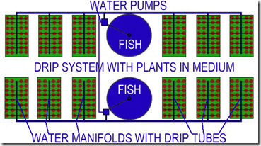 Air mengandung nutrisi dipompa ke media pembesaran melalui pipa dengan lubang kecil dan mengembalikan air yg sudah bersih ke kolam ikan melalui sistem gravitasi